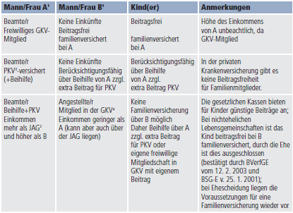 berücksichtigt werden. Zu Beginn des Beamtenverhältnisses meist als junge Beamtin oder junger Beamter oder bei Verbeamtung nach einer versicherungspflichtigen Beschäftigung ist die Versicherung in der privaten Kasse relativ günstig zu haben, mit zunehmendem Alter, bei Familienzuwachs und geringeren (Familien-)Einkommen sollte gerechnet werden. In der privaten Versicherung ist für jedes Mitglied ein eigener Beitrag zu entrichten – für Kinder genauso wie für Ehegatten und Lebenspartner. In der gesetzlichen Krankenversicherung sind für die Familienversicherung für Kinder und für nicht oder nur gering verdienende Ehegatten/Lebenspartner keine zusätzlichen Beiträge zu entrichten. Im Alter kommt es wieder auf das Einkommen an. Vor- und Nachteile haben im Übrigen beide Systeme.