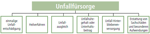 Diese Ansprüche sind somit das Äquivalent zum Recht der gesetzlichen Unfallversicherung (7. Buch Sozialgesetzbuch – Gesetzliche Unfallversicherung), jedoch mit beamtenrechtlichen Besonderheiten. Für Soldaten sind die speziellen Unfallfürsorgevorschriften zur Unfall- und Beschädigtenversorgung separat im Soldatenversorgungsgesetz (SVG) geregelt. Mit dem „Versorgungsänderungsgesetz 2001“ wurde die Unfallfürsorgeleistung auch auf das Kind einer Beamtin ausgedehnt, das durch deren Dienstunfall während der Schwangerschaft unmittelbar geschädigt wurde. Damit entsteht auch für das geschädigte Kind ein eigener Anspruch auf bestimmte Unfallfürsorgeleistungen, beispielsweise Heilverfahren oder Unfallausgleich.